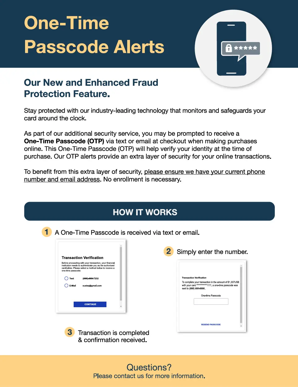 Cardholders may be prompted to receive a One-Time Passcode (OTP) via text or email when making payments online. See our flyer for more details >